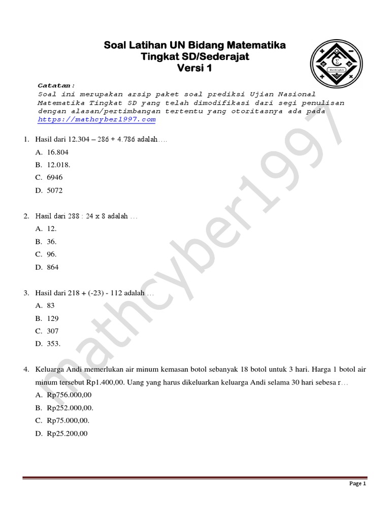 Download soal ujian nasional (un / usbn) 2018/2019 prediksi & tryout sekolah dasar (sd) bahasa indonesia, matematika, ipa, dilengkapi dengan 5 soal uraian. Soal un sd matematika pdf. Soal dan kunci jawaban uas pat ipa kelas 4 semester 1 gasal. Persiapkan diri kamu lebih awal untuk menghadapi ujian nasional / un sd. Soal matematika kelas 6 sd tentang masalah penalaran yang melibatkan bilangan bulat untuk ujian nasional terbaru oleh ariya wb posting komentar ujian nasional sd merupakan ujian. Bacalah setiap soal dengan teliti dan cermat. Soal usbn ujian sekolah bahasa indonesia kelas 6 sd tahun 2021 lengkap kunci jawaban pilihan ganda baca juga: 51280241 kartu soal ujian praktek doc. Contoh soal akm sd akan kursiguru berikan untuk seluruh pelajar sekolah dasar di indonesia. Lengkap 40 contoh soal latihan un ipa sd kunci jawaban paket. Berikut ini adalah contoh latihan soal ujian usbn matematika untuk sd kelas 6 dan kunci jawaban sesuai dengan kisi kisi terbaru 2018. Download soal ujian nasional un unbk dan unkp 2019 smp mts lengkap semua pelajaran matematika sd menentukan jarak waktu dan kecepatan dilengkapi dengan contoh soal dan pembahasan download soal ksm kompetisi sains madrasah mts 2018 tingkat kabupaten kota naskah asli lengkap. Soal ujian sekolah sd pendidikan agama islam pai.